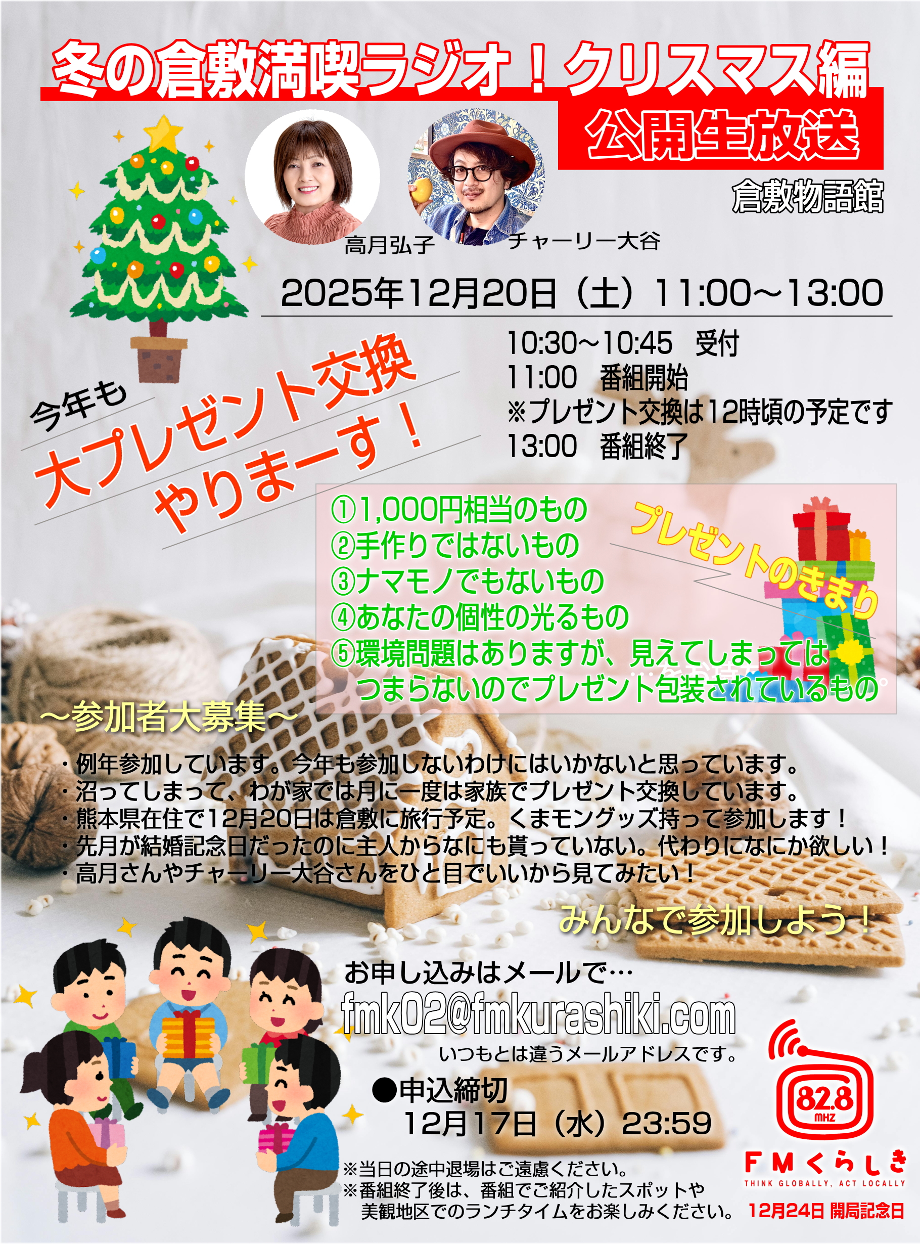 「秋の倉敷満喫ラジオ!」は、季節が冬に変わっても放送があります。「冬の倉敷満喫ラジオ!クリスマス編」。美観地区のおすすめのお店の情報やクリスマスの話題を、倉敷物語館からお送りします、おおクリスマス。